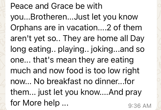 “Peace and grace be with you brethern. Just let you know that the kids are on vacation. They are home all day long eating, playing, and joking, and so on. That means they are eating much and now food is too low right now. No breakfast no dinner for them. Just let you know. And pray for more help.” Pastor
